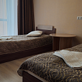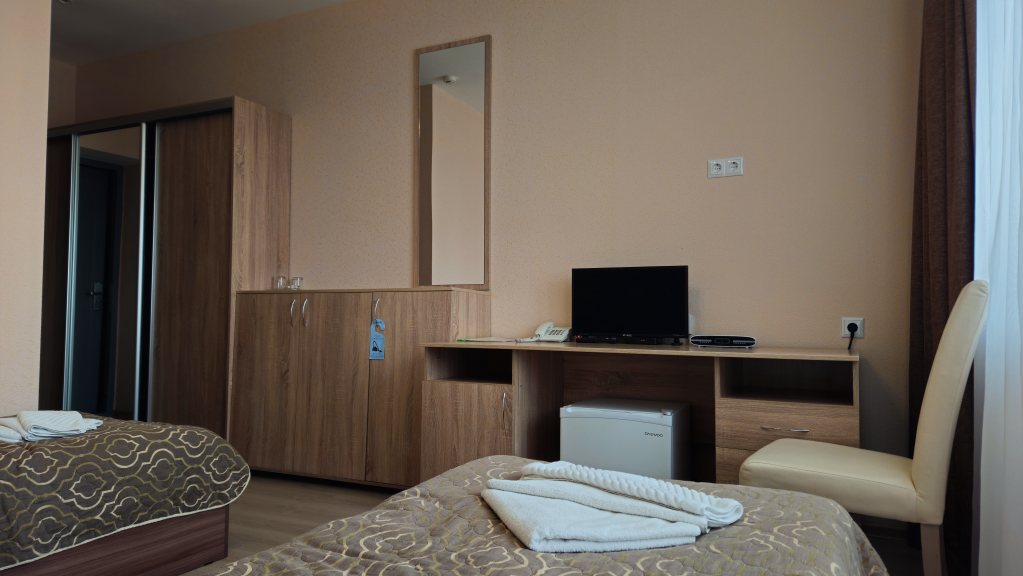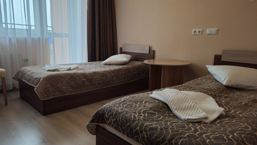 С возможным подселение Уютный небольшой номер с двумя односпальными кроватями, телевизором, санузлом. При бронировании номера одним человеком возможно подселение. |